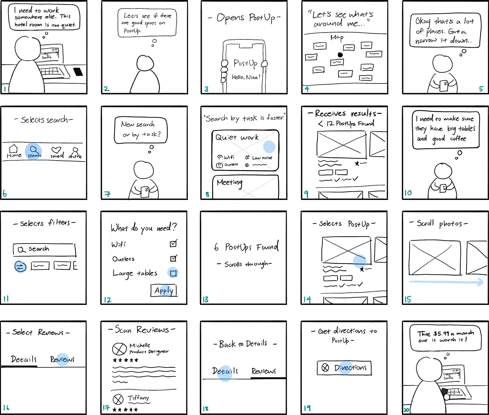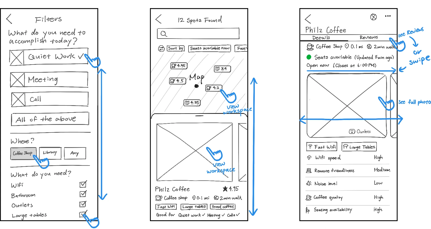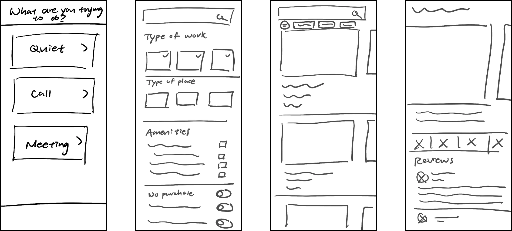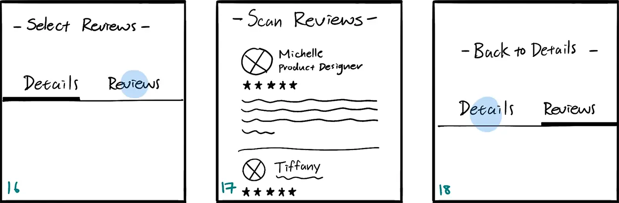 The final highlight of my storyboard evolution was adding a 'Reviews' section for each workspace. After Nina learns about the workspace's details, she might want to see what other people have to say or seek more details, especially since that's what she's used to doing with her existing tools. For a more intuitive experience, users may navigate between the pages by swiping horizontally.