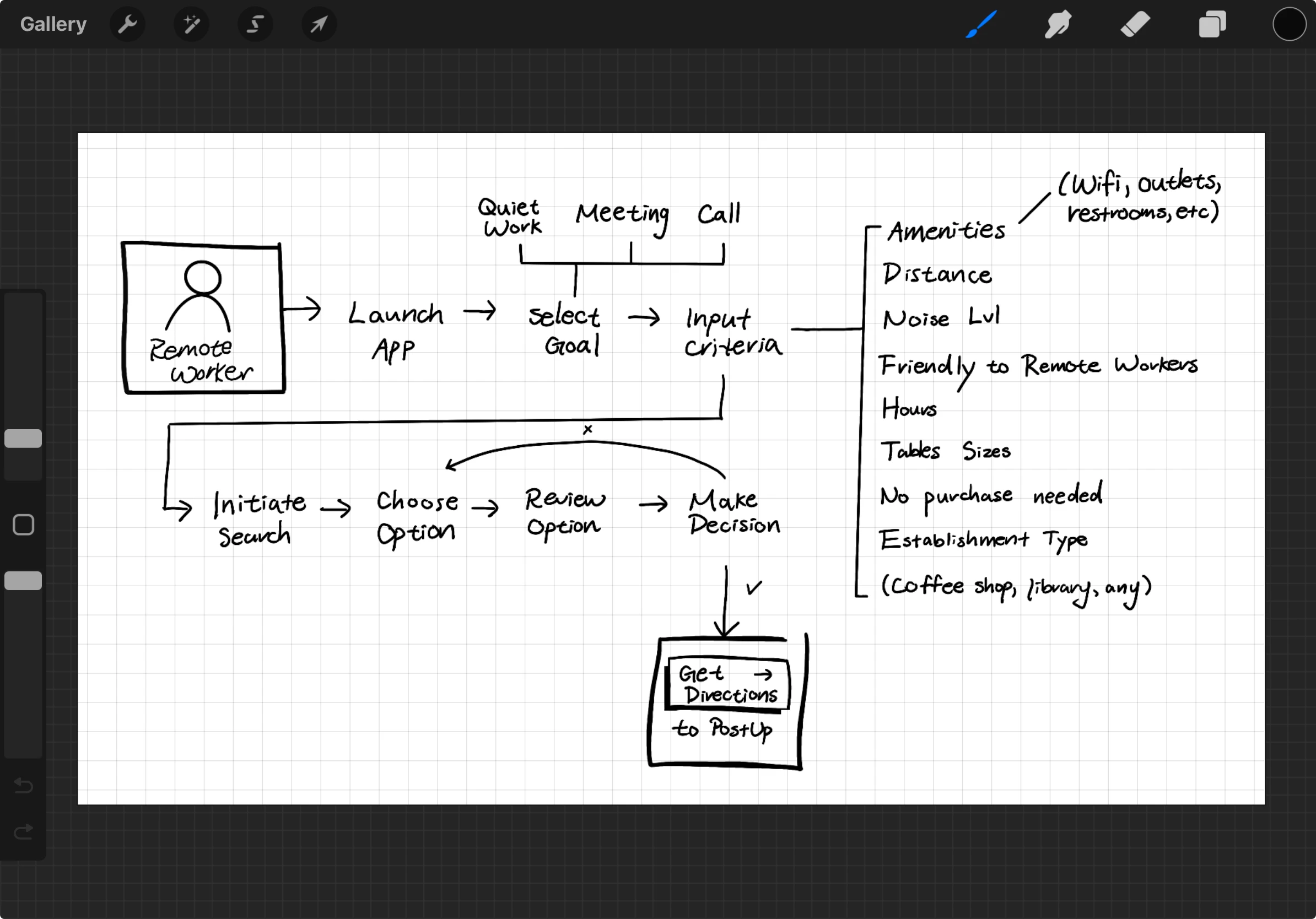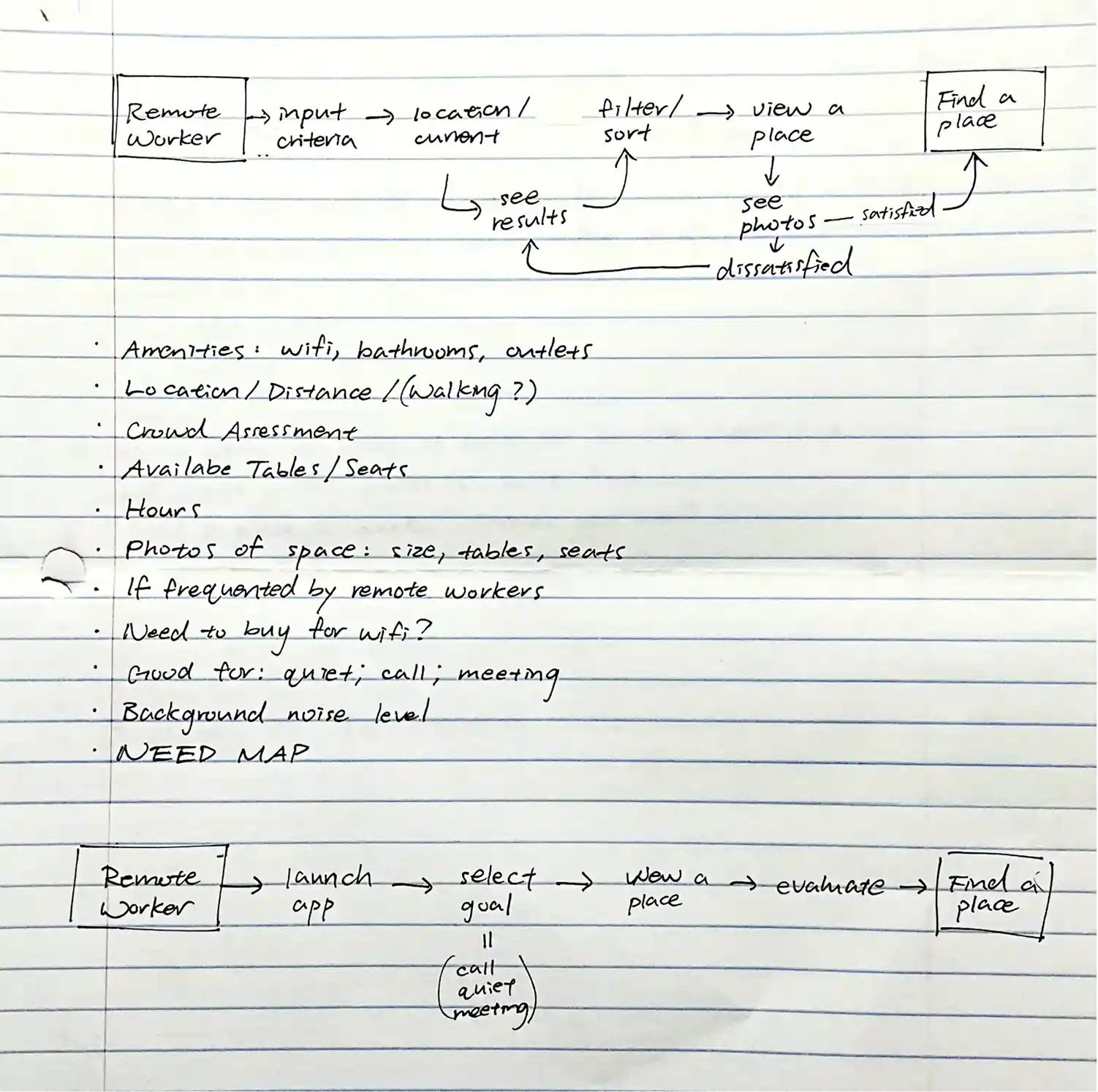 It was finally time to design and prototype! As I reviewed my work so far, I realized I made a mistake: Nina's journey ends when she settles into the workspace, not when she chooses a workspace. To stay organized, I sketched a new map to adjust my scope and brainstormed a list of features before prototyping.