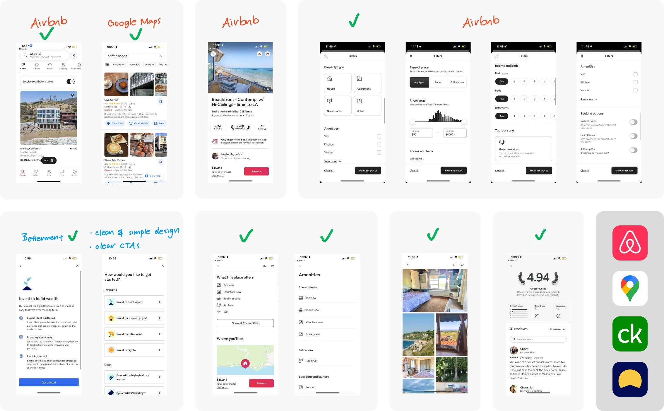 I wanted to create a clean interface with search and product comparison features, so I performed lightning demos of Airbnb, Google Maps, Credit Karma, and Betterment to gather insights into best practices and user expectations. I specifically selected screens that display features like search filters, search results, and individual products.