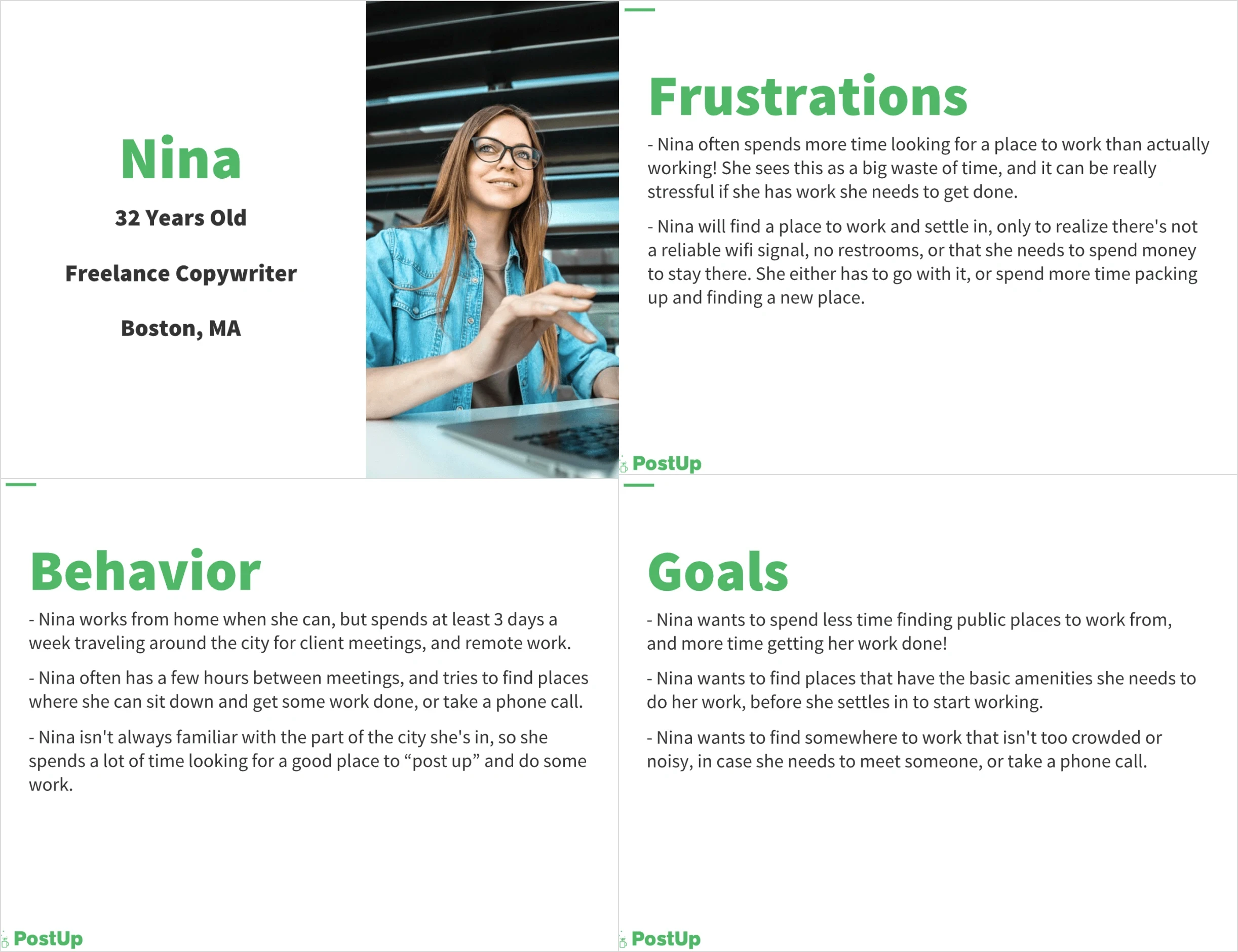 Based on my insights, I realized the user persona PostUp provided didn’t capture the whole story. I also found it text-heavy and hard to scan, so I reworked it to better guide my design process.