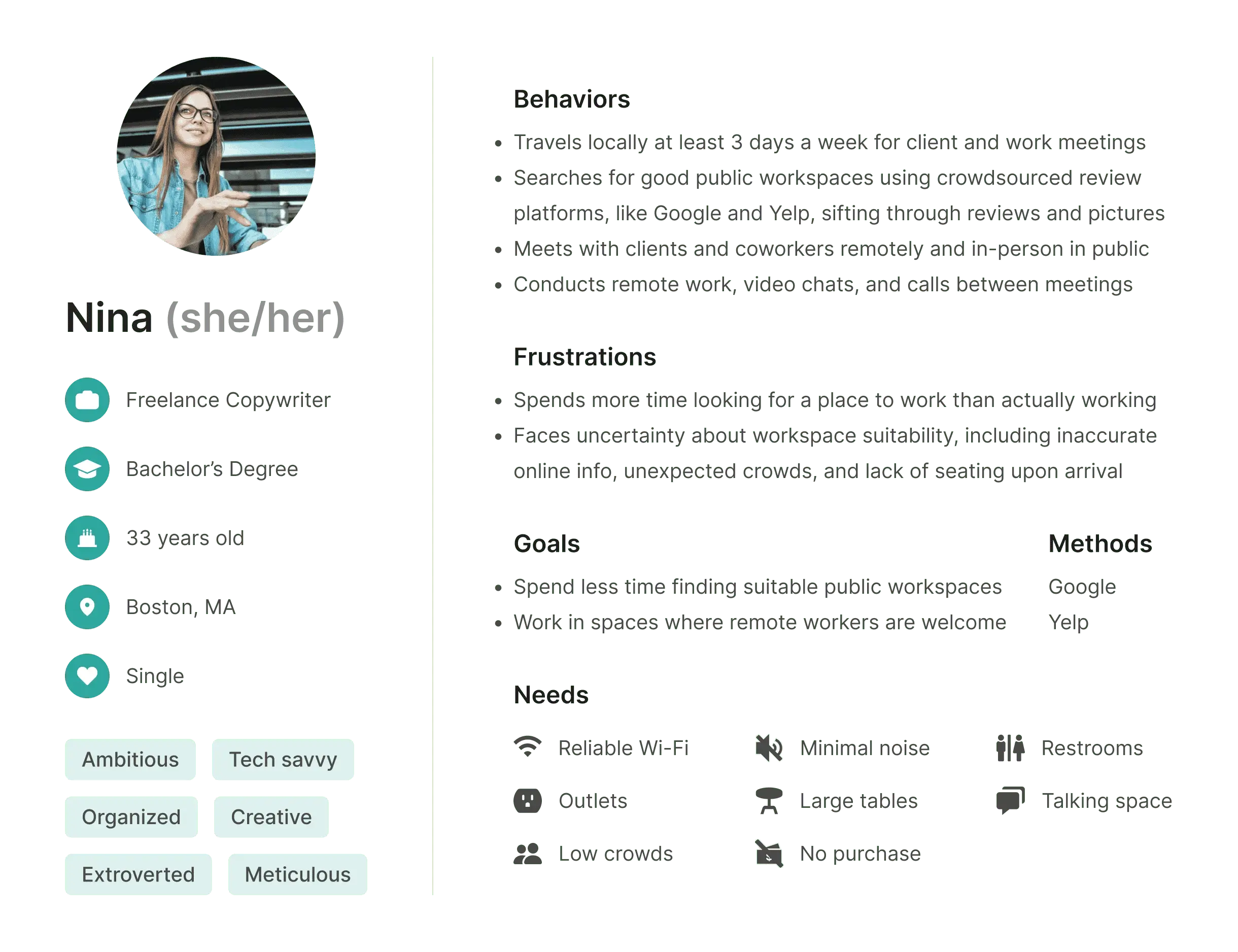 My new persona includes key details from user quotes and interviews. The process of reworking the persona helped me better understand Nina. My new persona helped me stay more focused on Nina’s specific needs throughout the sprint, ensuring the app was aligned with user goals.